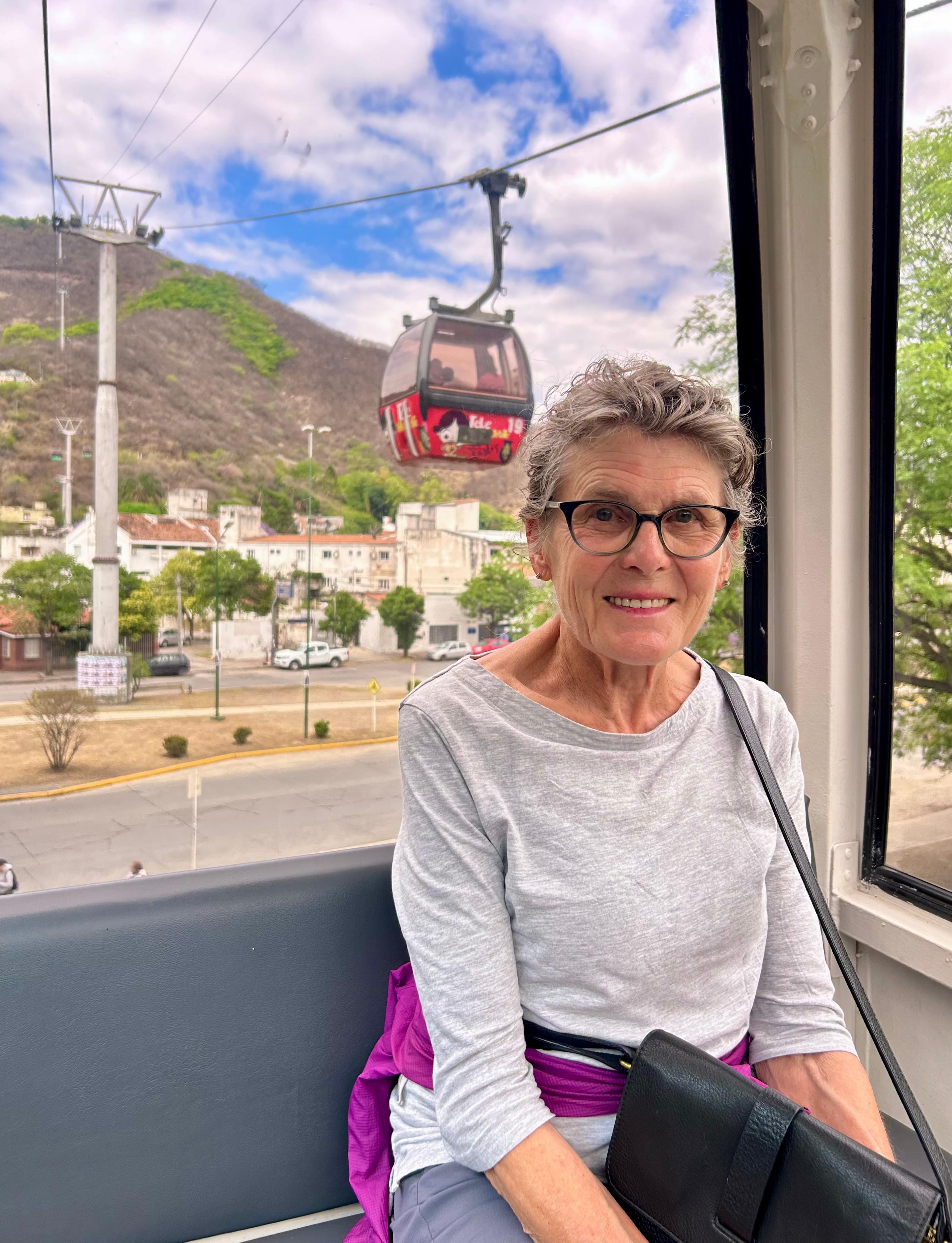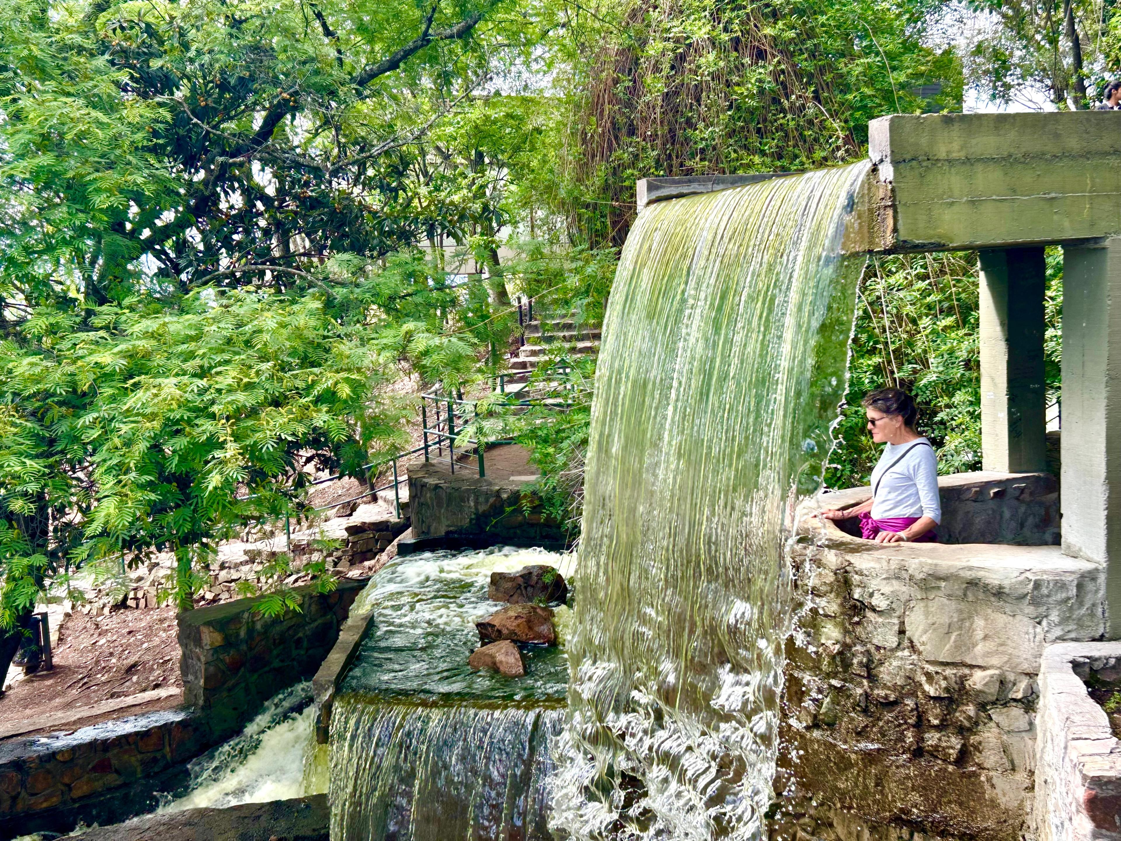 Yesterday we took a tram up to the highest nearby hilltop. We were surprised by the manicured park laid out on the top, inclusive of a man-made water feature, and enough paths to see every direction. We were mystified by Jim’s compass app, which took a little ‘fiddling’ with to get it to read correctly, and not 180*off (the sun always sets in the west, right?!). Thank goodness being oriented anywhere we are is one of Jim’s extraordinary skills, otherwise I’d be lost all the time…